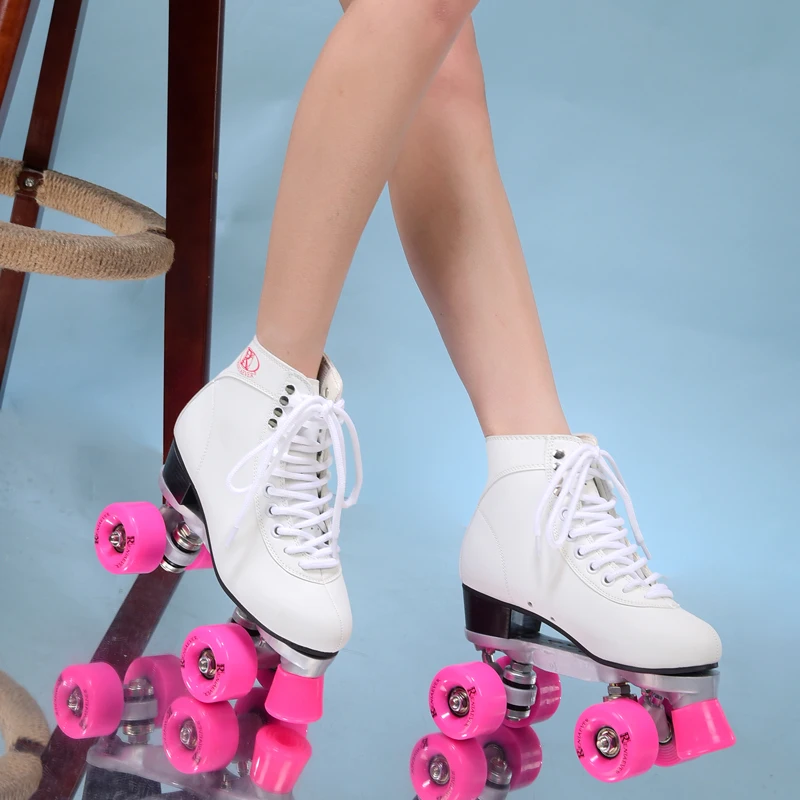 استعارات من مزدوجة زلاجات دوارة الأسطوانة التزلج 4 عجلات البكرات أحذية المرأة البولي يوريثين الوردي عجلات حذاء أبيض شحن مجاني